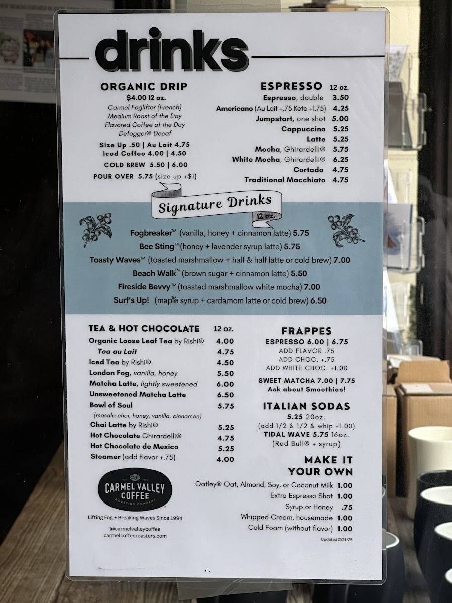 From quality beans to delicious pastries, every offering is crafted with care. Whether enjoying a quick coffee or lounging in the inviting seating area, Carmel Valley Coffee Roasting Co ensures a cozy and satisfying ambiance for all coffee enthusiasts.
